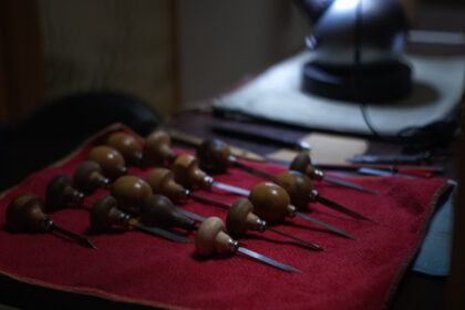 各部への彫刻を終え、いよいよ仕上げです。着用によってついた傷も歴史ですから、なるべくそれを残しながら。