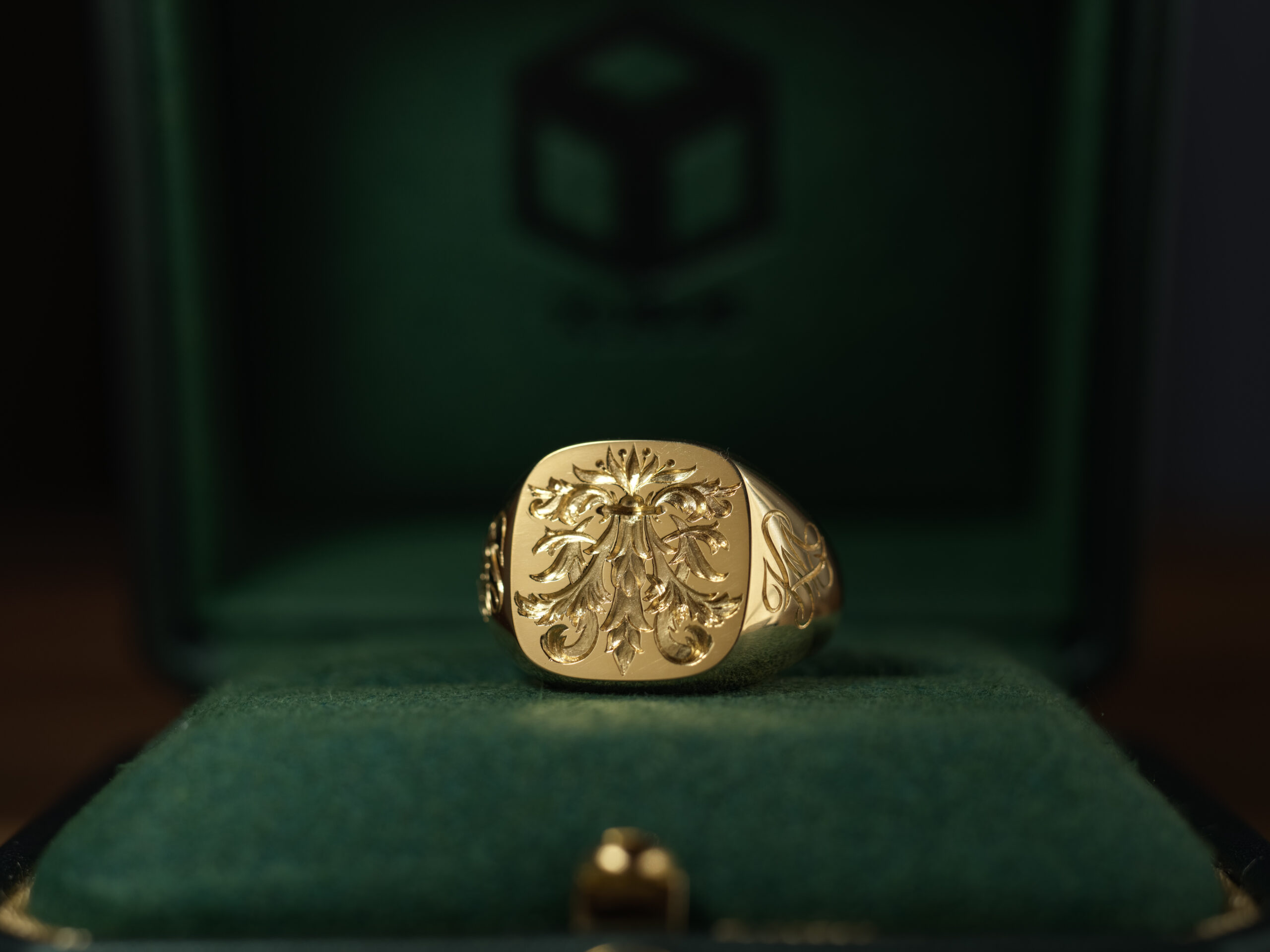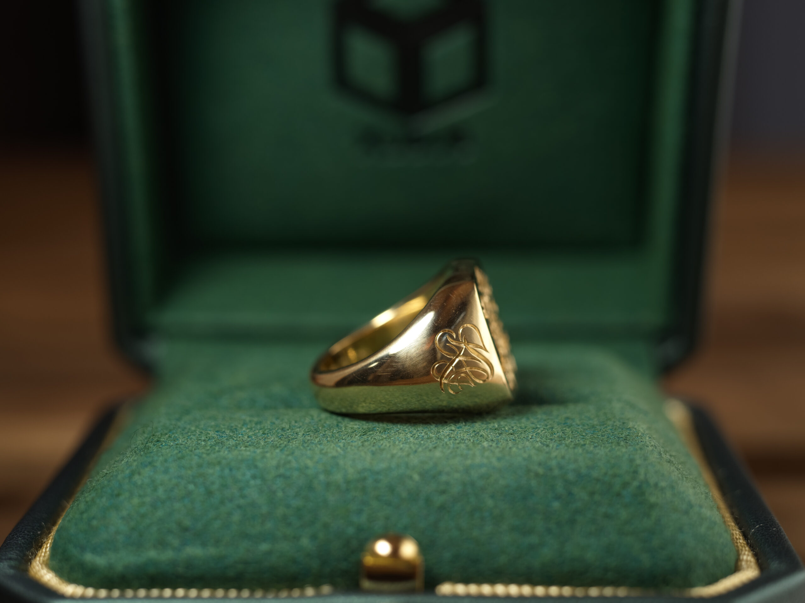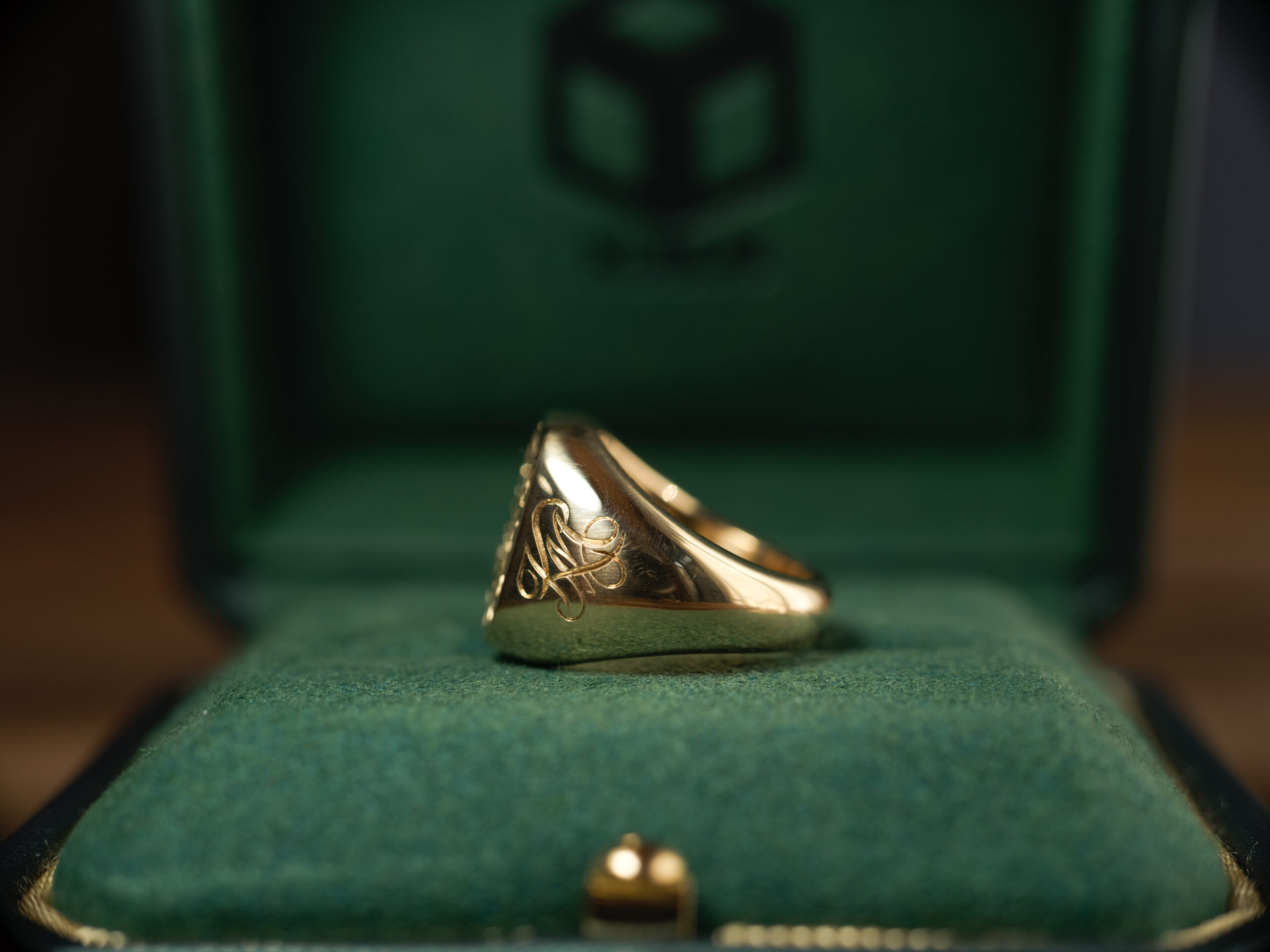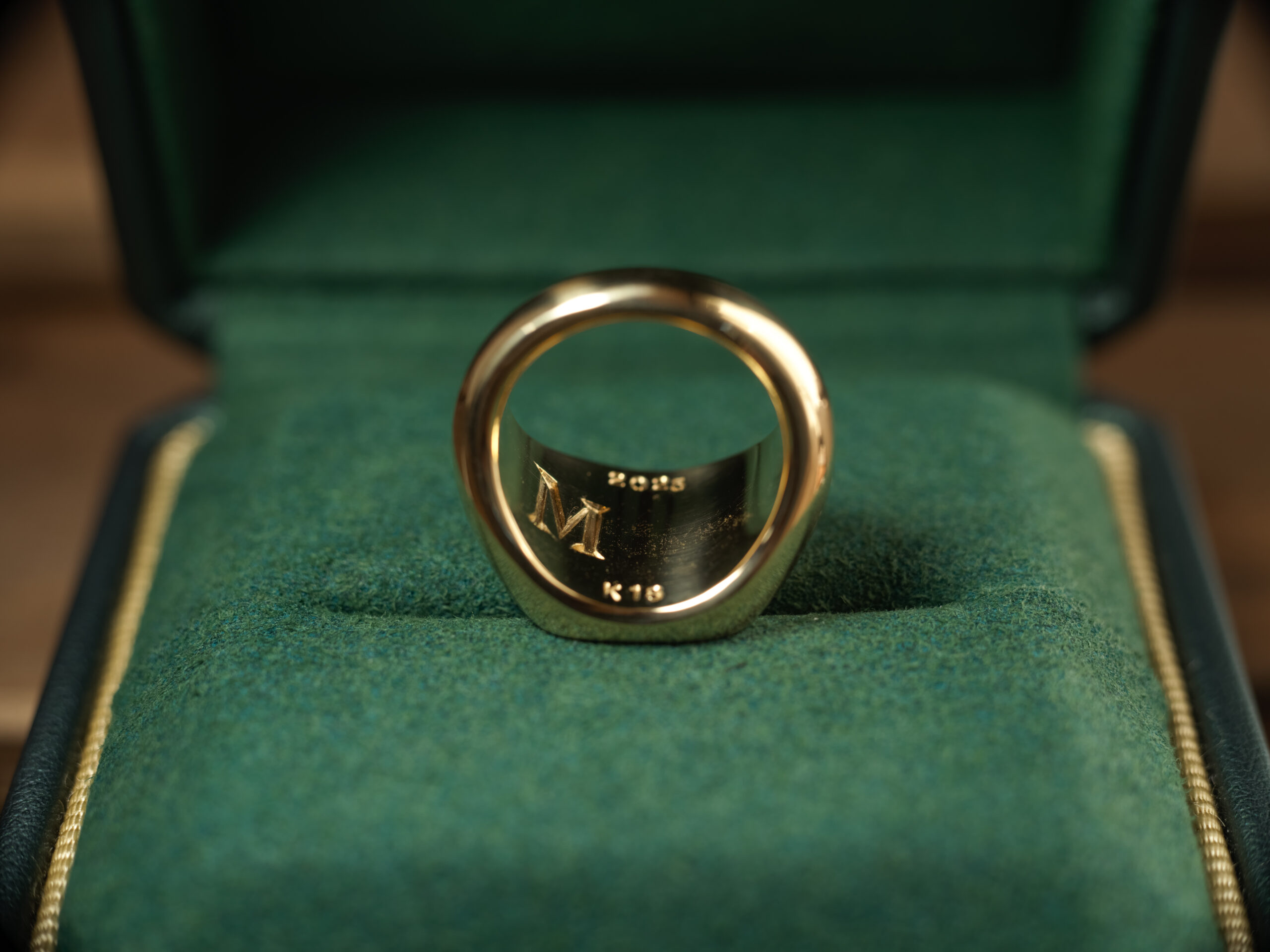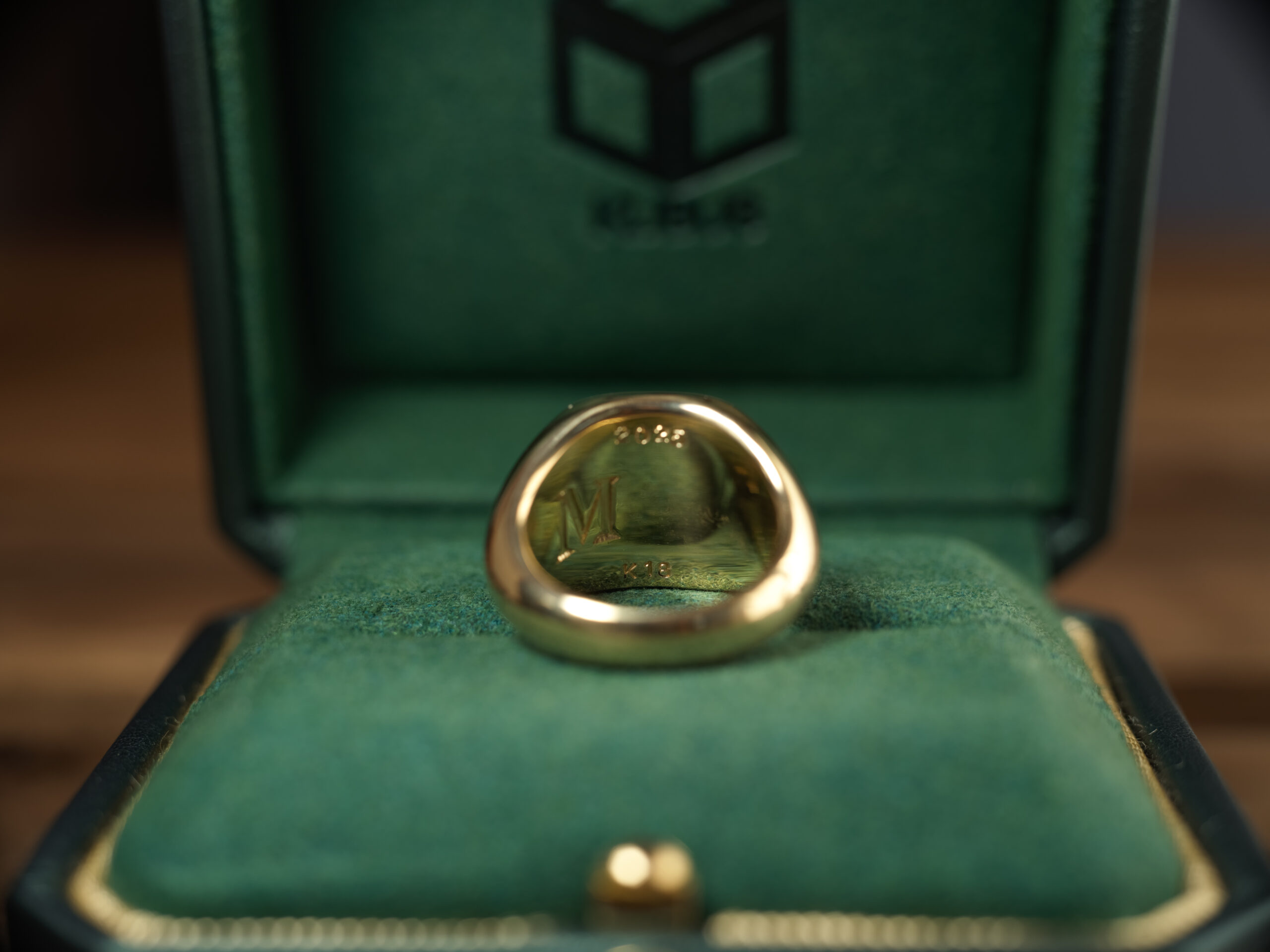 Hand Engraved Mellow Square Signet Ring(K18YG)「木村」+「KHJ・KM(側面彫刻)」+「M(裏面彫刻)」