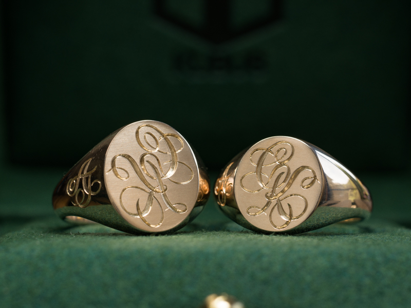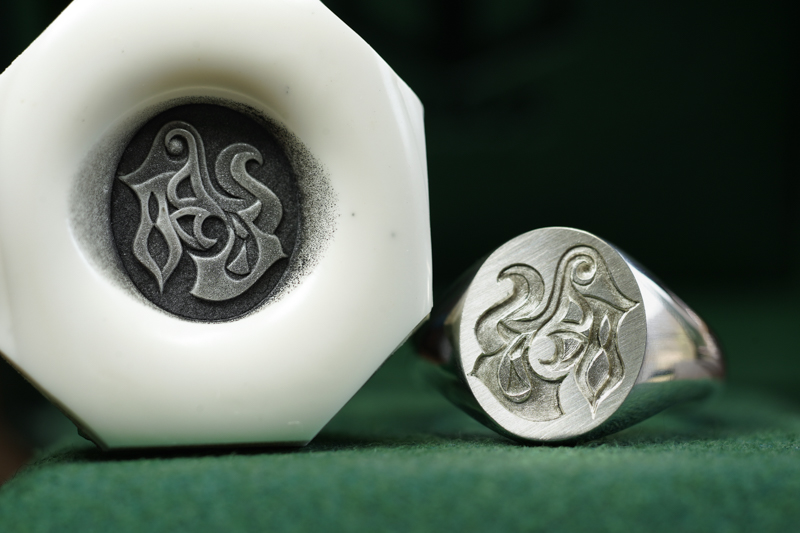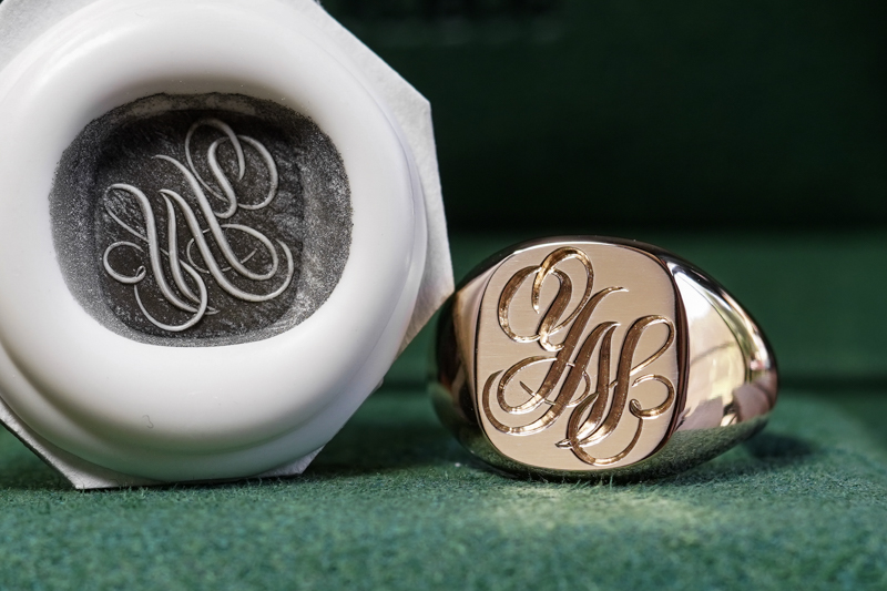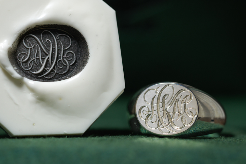 シグネットリングには、所有者の存在を示すための厳格な記号の一つとして古くから紋章が彫刻されてきました。(『紋章の手彫り彫刻”Heraldic engraving”』)そして、それと並んでシグネットリングと歴史的に密接な関係があるのが「モノグラム」です。
