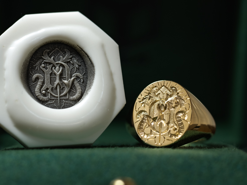 そのため、当店ではご依頼ごとに新たにモノグラムのデザインを描き起こしています。ご依頼者の価値観や美意識、シグネットリングへ託したい意味合いや想いを踏まえたうえで、一つの象徴としてモノグラムを構築していきます。それは単なる文字の組み合わせではなく、持ち主を象徴する”署名”として成立するものです。
