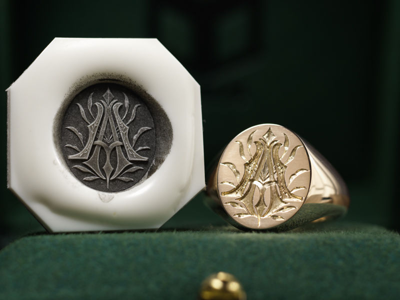 こうした制作工程を経るため、当店におけるモノグラムデザインやそれが刻まれたシグネットリングは多種多様なものとなります。そこで、以下ではモノグラムをそのデザインの特性ごとに分け、それぞれの特徴とモノグラムの作成費用及び手彫り施工料を作例の写真とともにご紹介します。
