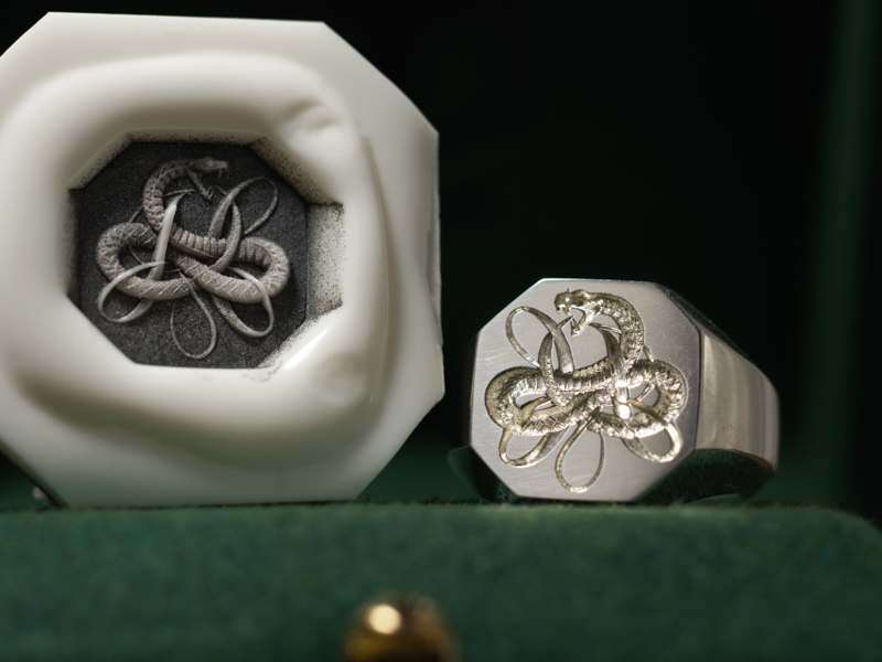 作成したモノグラムは、縦横1cmほどのシグネットリングの印台へ伝統的な彫刻技法によって手彫りで刻み込まれます(『KUBUSの手彫り彫刻技法』)。彫刻は図案をそのまま転写する作業ではなく、金属という特性を踏まえながら、描いたモノグラムの構造や意味を更に発展させるための立体的な彫刻表現です。モノグラムデザインの作成もシグネットリング本体の造型作業も全て、この彫刻に向かって行われます。